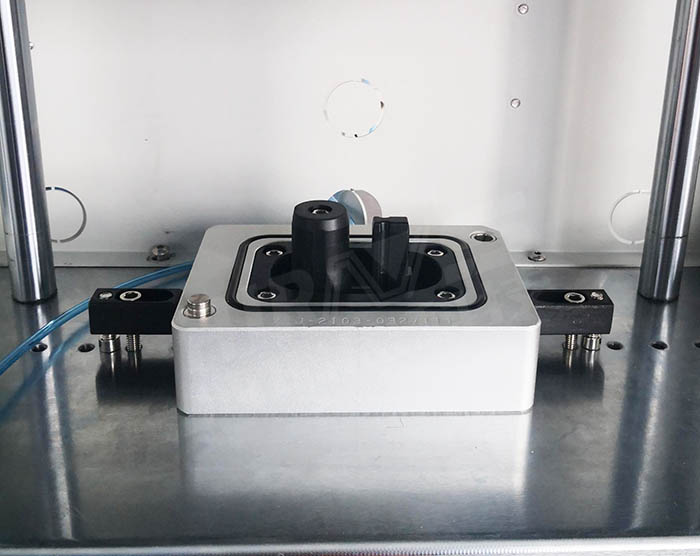 检测方案:直接测试方法,根据控制器的结构定制模具,用来密封充电座的周围,模具上设计有排气孔,客户可自由选择直接测试或间接测试。使用的测试参数:测试压力30KPA,充气时间5S,稳压时间:10S,测试时间:5S,泄漏值:0.05KPA。通过监测气压的变化来测试出产品的泄漏量,对超出泄漏值上限或达不到测试压力的充电坐系统自动判定为NG,对合格的产品,自动为OK。