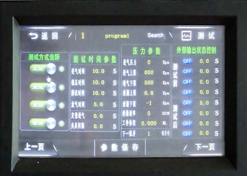 采用流量的检测方式,按下仪器启动键,开始充气,进气上限600Kpa,时间10s,稳压10s,测试10s。测试过程中,如果泄漏值超过0.8Kpa,则仪器自动判定为不合格。;反之则为合格品。