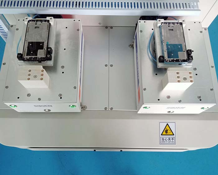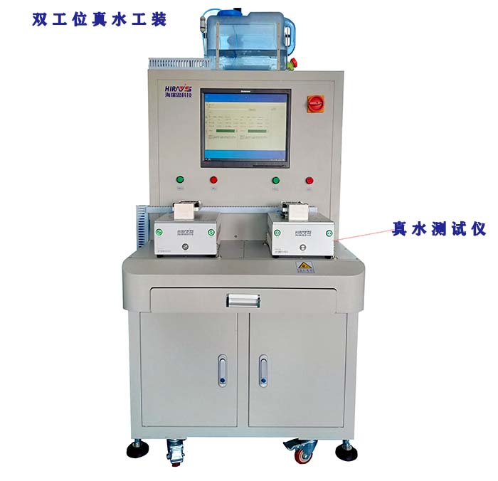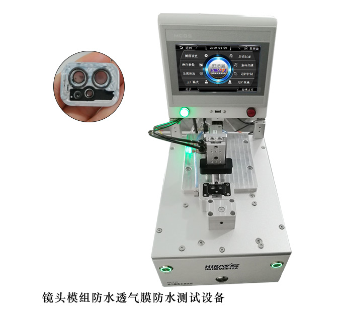 本设备采用真水测试的方式,通过自动真水检测仪推动真水作用在手机咪孔、平衡孔的防水 透气膜上,经过一段时间后,由仪器检测密闭腔体内有无水滴,如无,则相当于检测区域内是无水汽的;如有水滴,则将水滴转成水汽,检测密闭墙体内水汽的量,对比密闭腔体内无水汽时有一个很明显的变化。