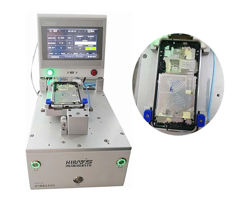 海瑞思真水测漏仪是根据测试产品提前设置好程序和测试压力,将测试产品放置在测试夹具上,按住启动按钮就可以开始检测,如果手机防水透气膜是良品,从出水口喷出的出就不会穿过手机的防水透气膜,如果防水透气膜是不合格的,水就会穿过防水透气膜。并且,当防水透气膜贴装在手表上如果没有贴好的,也会从贴装的位置漏水。