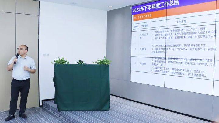 接下来是生产中心的技术二部、组调&机加部等负责人纷纷上台,给出了上半年的数据总结。并依据上半年存在的不足之处提出了解决方案,下半年要继续推进生产流程的规范化,加快响应速度;各部门坚持严格标准,继续抓好产品质量,让生产更顺利,客户更满意。