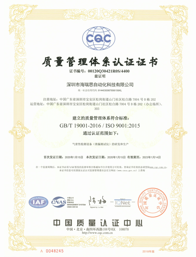 ISO9001认证是国际公认的高标准的质量管理体系,本次ISO 9001:2015质量管理体系认证的通过,也是对海瑞思品质的肯定。海瑞思一定会不负众望,继续做气密性检测设备的领头兵,为客户提供可信赖的,高质量的气密性检测设备。