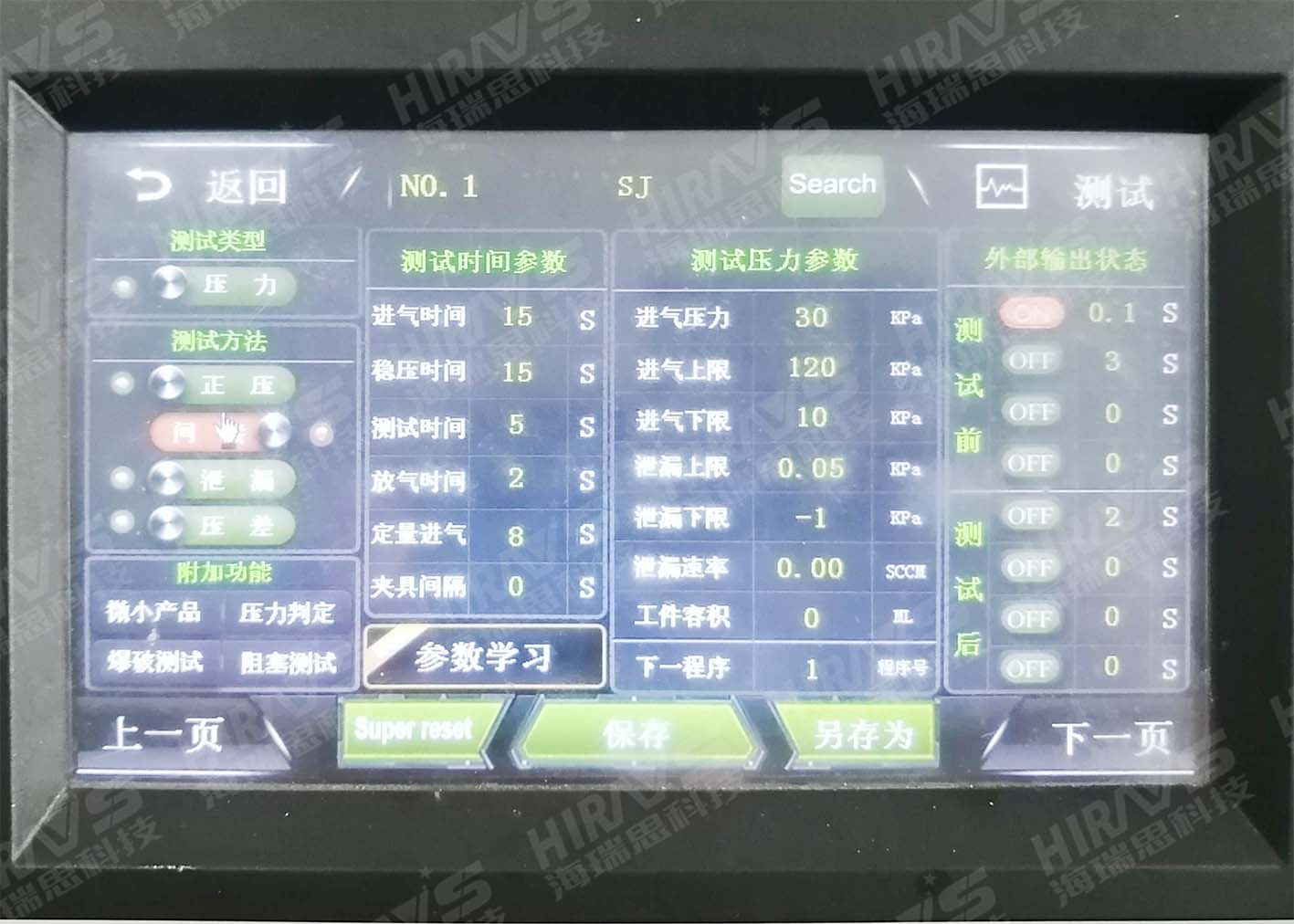 采用间接测试的检测方式,选择设定好的程序,按下设备启动键,仪器开始检测。充气30Kpa,时间15秒,稳压时间15秒,测试时间5秒、定量进气8秒。如果测试过程中,泄漏值未超过50pa,则说明该被测品为合格品,反之则为不良品。