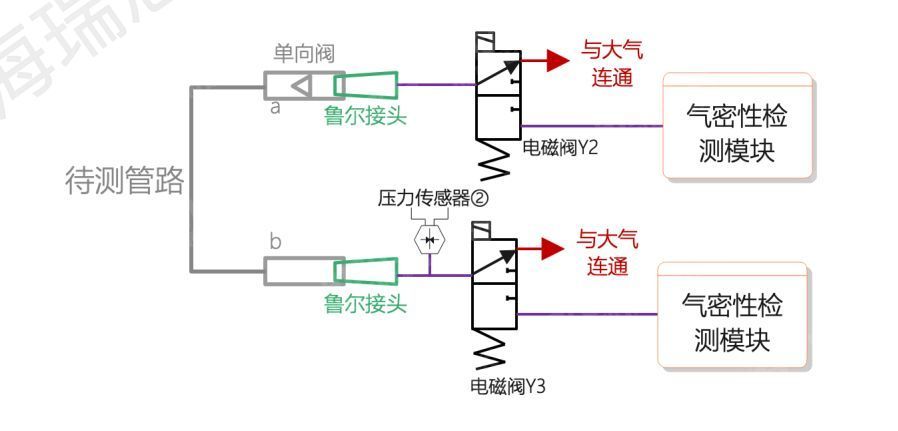 2.测试单向阀是否畅通,管路是否堵塞。将阀Y2关闭,阀Y3打开,从跟阀Y2连接的气密性检测模块中冲入设定压力的气体,通过检测充气阶段传感器②的压力,如果低于设定值,则不合格,输出“a-b路堵塞”,如果在设定值内,则输出OK信号,完成测试。