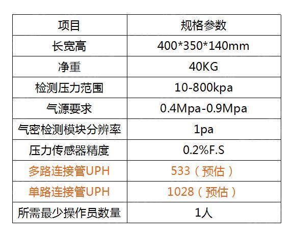 采用4通道结构,可以剩下进气、稳压、测试、放气、充气并判断,不能节省 放产品、测完拿走产品的时间,综合计算节拍为:3.5s/个,UPH=1028;【10小时检测产能为:10280个】