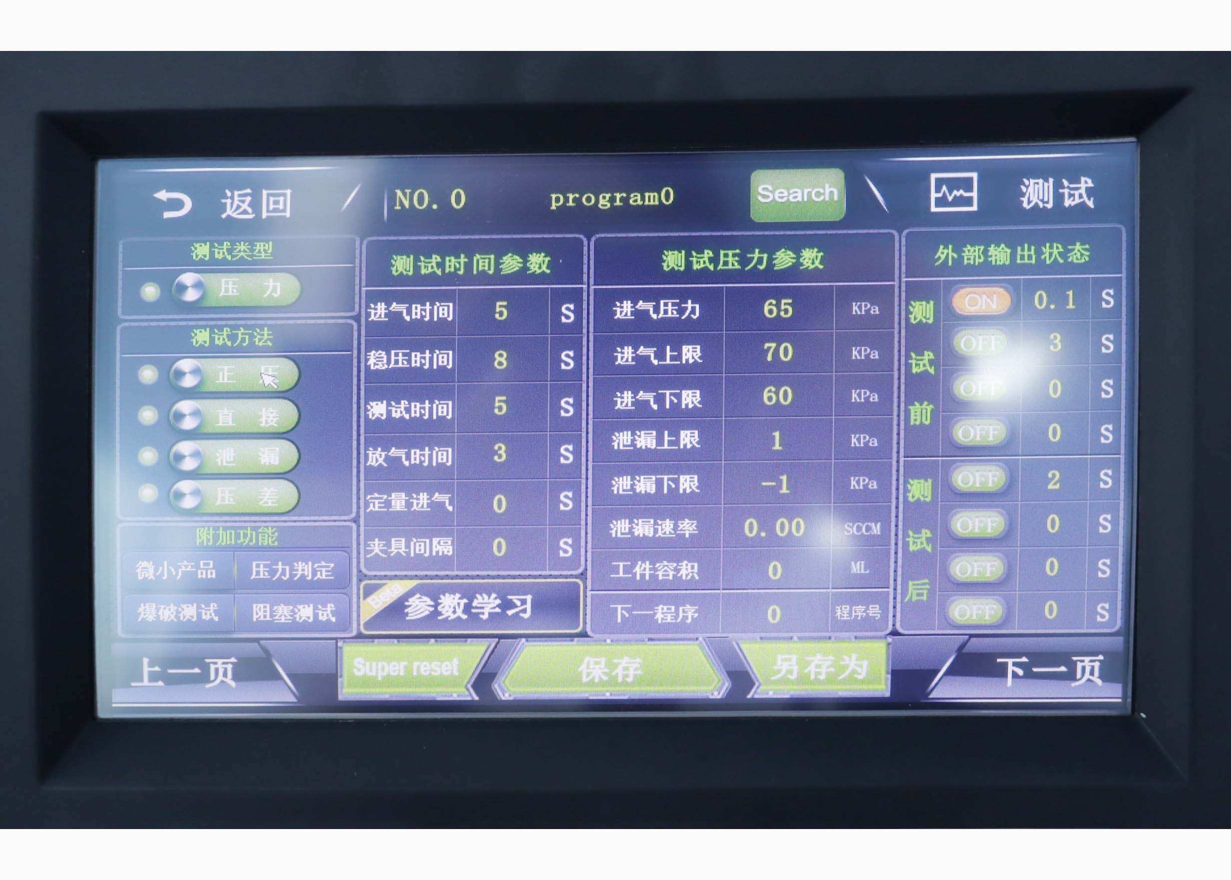 将散热器放入模具中,开始测试。测试压力为65Kpa ,允许的最大泄漏量是1Kpa . 进气时间5s,稳压时间8s,测试时间5s,放气3s。