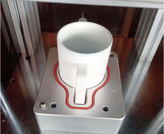 检测方法:我们采用气密性检测设备对其进行防水性和密封性检测,就需要根据杯子的形状定制磨具工装来对其进行间接检测。对杯子内部进行密封,测试杯子整体的密封性,测试压力15KPA,充气时间10秒,稳压时间10秒,测试时间5秒,泄漏值100PA。