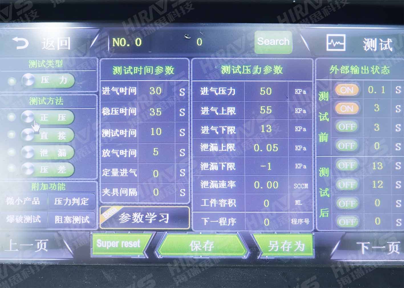 将待测品放进模具中,并固定。按下仪器启动键,开始检测。充气50kPa,时间为30s后开始进入稳压阶段,35s后开始测试,10s内如果传感器监测到泄漏值没有超过设定值50Pa,仪器自动判定结果OK,即说明待检测品为合格品。