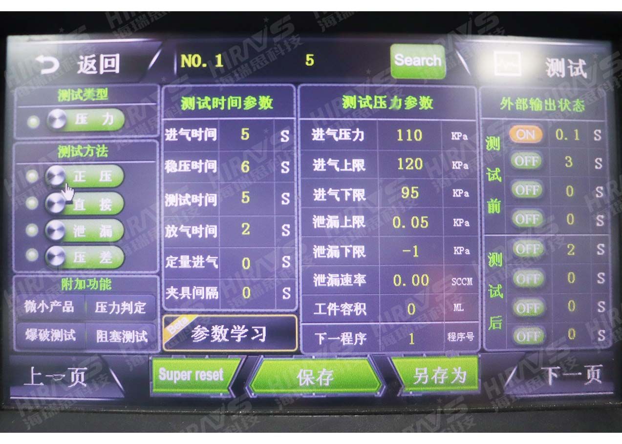采用直接测试的方法,将待测品放入模具中,充气110Kpa,时间为5s,稳压6s,测试时间5s,测试过程中,如果泄漏值未超过50pa,则该检测品为合格品。