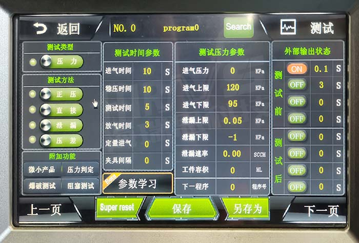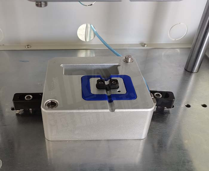 解决方案:采用直接测试方法,根据测试产品的结构设计模具用于封堵穿线孔部位。将产品放入模具中按下启动键后上模下压与下模闭合代密封穿线孔与线接触的部位进行测试。测试压力110KPA,充气时间10S,稳压10S,测试时间5S,仪器通过监测气压变化来检测产品的密封情况,并根据测试的参数对测试结果判定OK或NG。