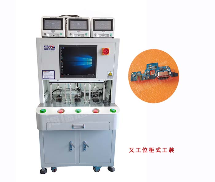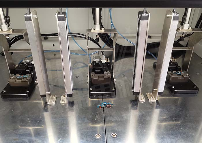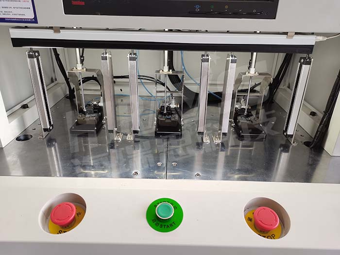 解决方案:采用直接测试方法,根据排线的结构定制模具,将排线放到模具中,按下启动键顶柱下压固定排线,下模侧推封堵数据充电接口后,仪器进行测试程序,先用17KPA的压力对测试部位进行充气5秒,然后稳压10秒,最后测试5S,通过监测气压的变来检测数据充电接口的泄漏情况。检测结果会根据设定的充数来判定OK与NG。整个测试过程大概是25秒,可以同时测试三个产品,也可根据客户的需求定制多工位的工装,提高产能。